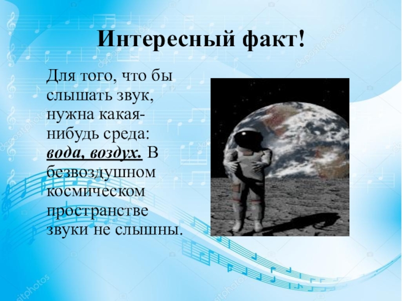 Интересный факт!Для того, что бы слышать звук, нужна какая-нибудь среда: вода, воздух. В безвоздушном космическом пространстве звуки