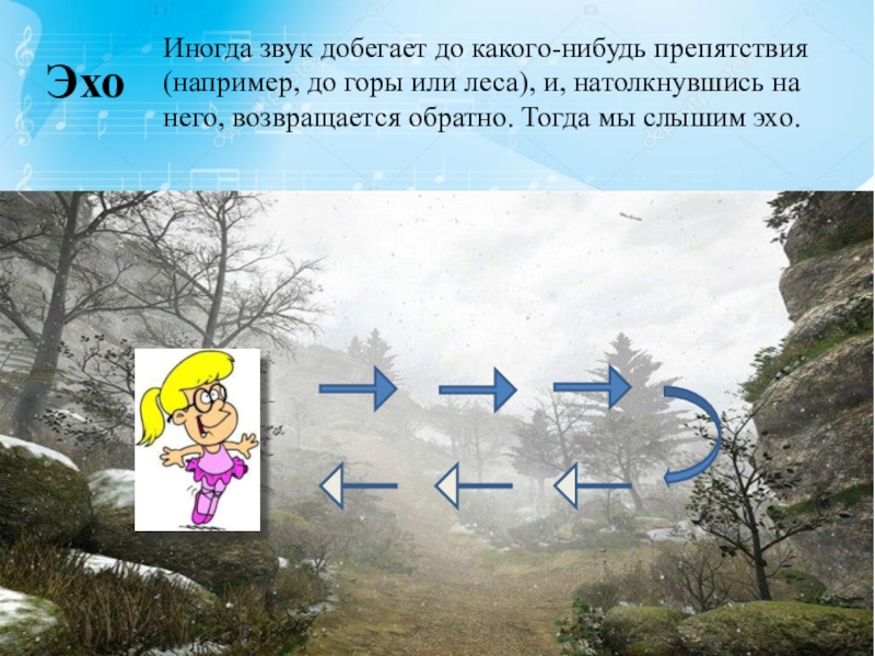ЭхоИногда звук добегает до какого-нибудь препятствия (например, до горы или леса), и, натолкнувшись на него, возвращается обратно.