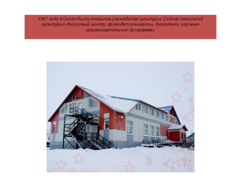1967 году в Сеяхе была открыта учрежЦентр, проводят концерты, дискотеки, игровые и развлекательные программы.. дения культуры . Сейчас сеяхинский культурно-досуговы