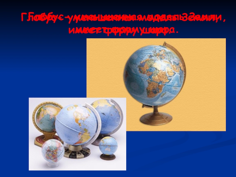 Глобус- уменьшенная модель Земли, имеет форму шара. Глобус- уменьшенная модель Земли, имеет форму шара.