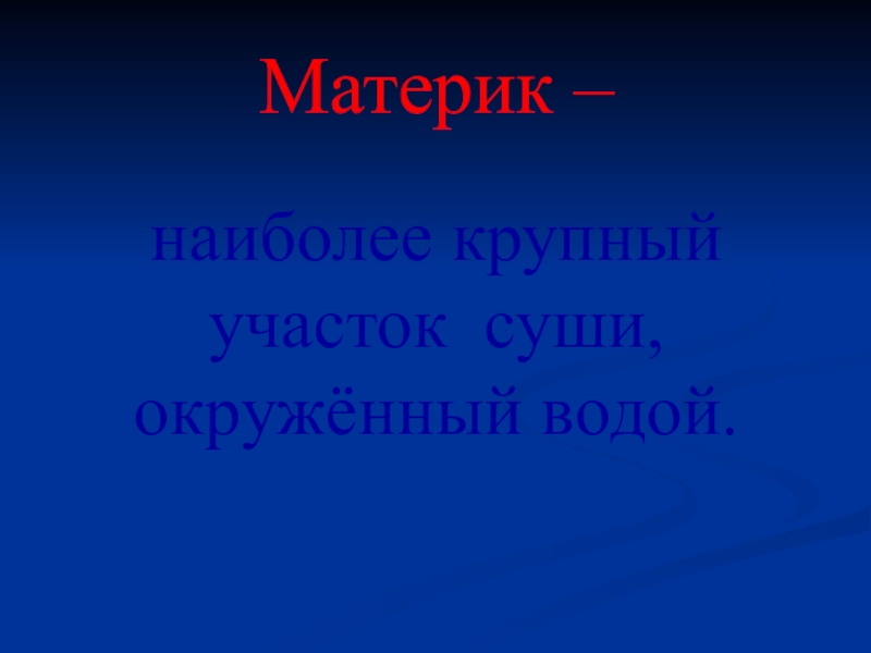 Материк –   наиболее крупный участок суши, окружённый водой.