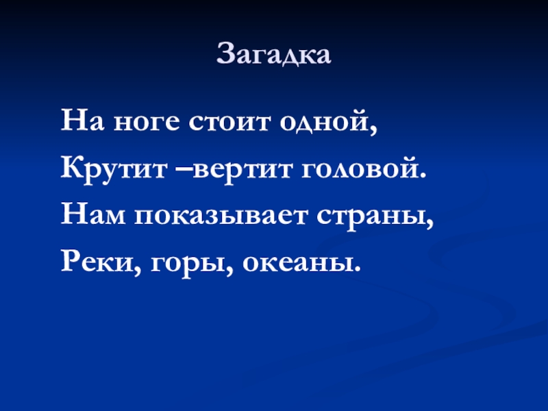 ЗагадкаНа ноге стоит одной,Крутит –вертит головой.Нам показывает страны,Реки, горы, океаны.