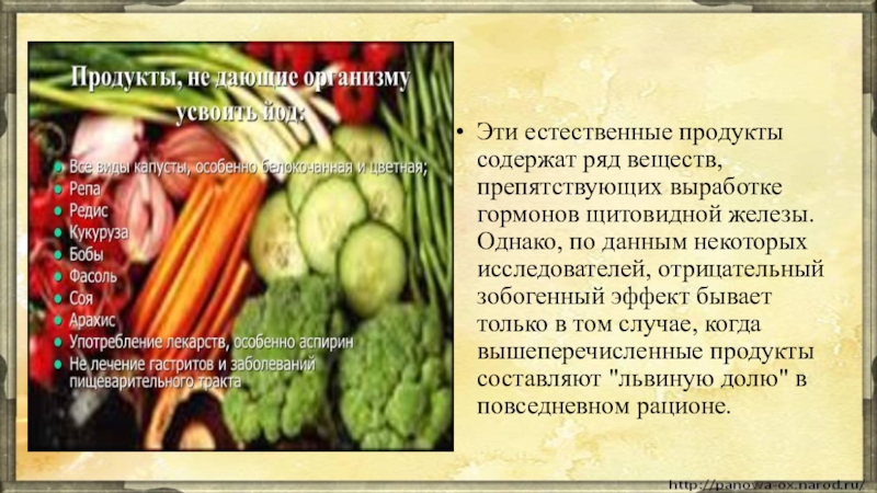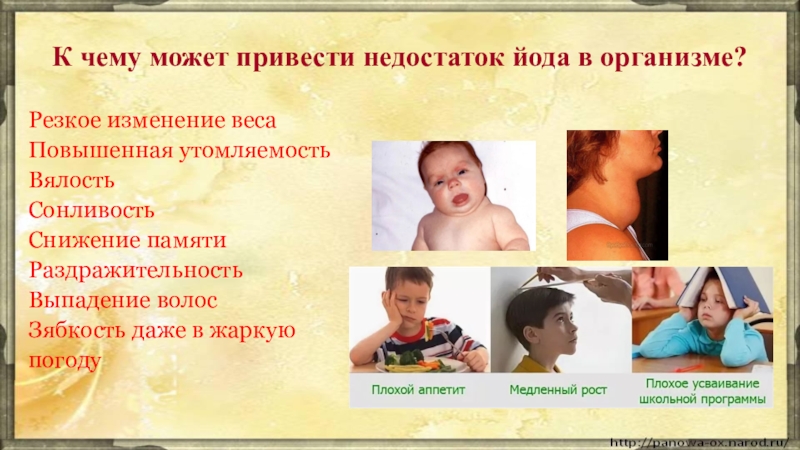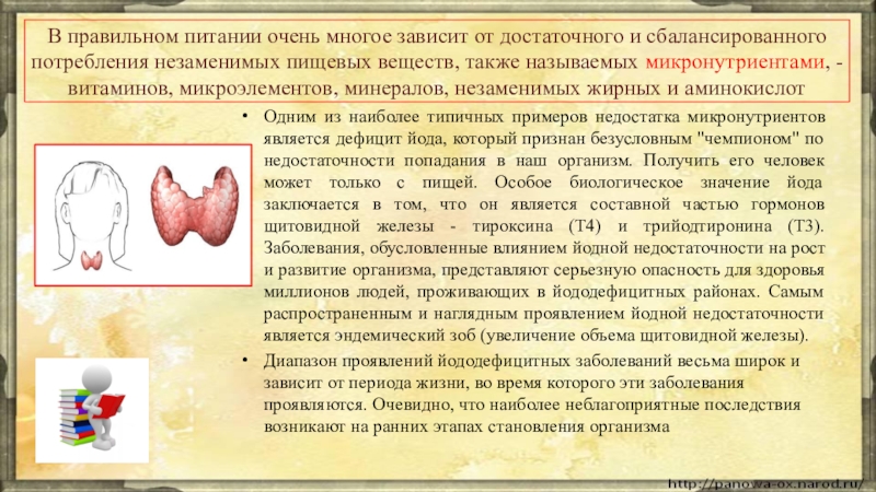 Одним из наиболее типичных примеров недостатка микронутриентов является дефицит йода, который признан безусловным "чемпионом" по недостаточности попадания в наш организм. Получить его человек может только с пищей. Особое биологическое значение йода заключается в том, что он является составной частью гормонов щитовидной железы - тироксина (Т4) и трийодтиронина (Т3). Заболевания, обусловленные влиянием йодной недостаточности на рост и развитие организма, представляют серьезную опасность для здоровья миллионов людей, проживающих в йододефицитных районах. Самым распространенным и наглядным проявлением йодной недостаточности является эндемический зоб (увеличение объема щитовидной железы).