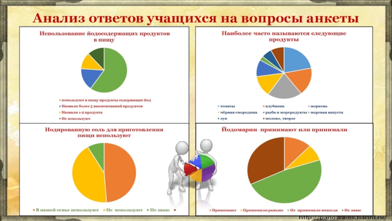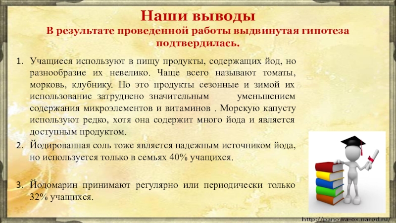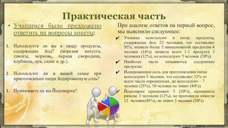 Ученики используют в пищу продукты, содержащие йод. 23 человека, что составляет 92%, назвали более 5 наименований продуктов 4 человек (16%) назвали всего 1-2 продукта 3 человека (12%), не используют 5 человек (20%).