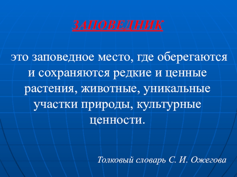 ЗАПОВЕДНИК  это заповедное место, где оберегаются и сохраняются редкие и ценные растения, животные, уникальные участки природы, культурные ценности. Толковый словарь С. И. Ожегова