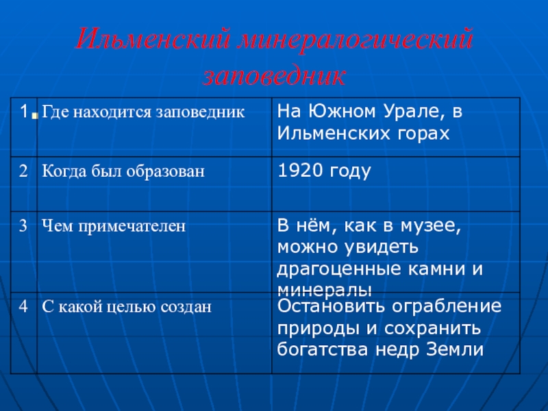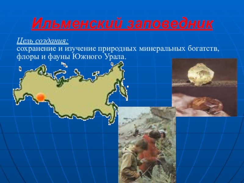 Ильменский заповедникЦель создания:сохранение и изучение природных минеральных богатств, флоры и фауны Южного Урала.