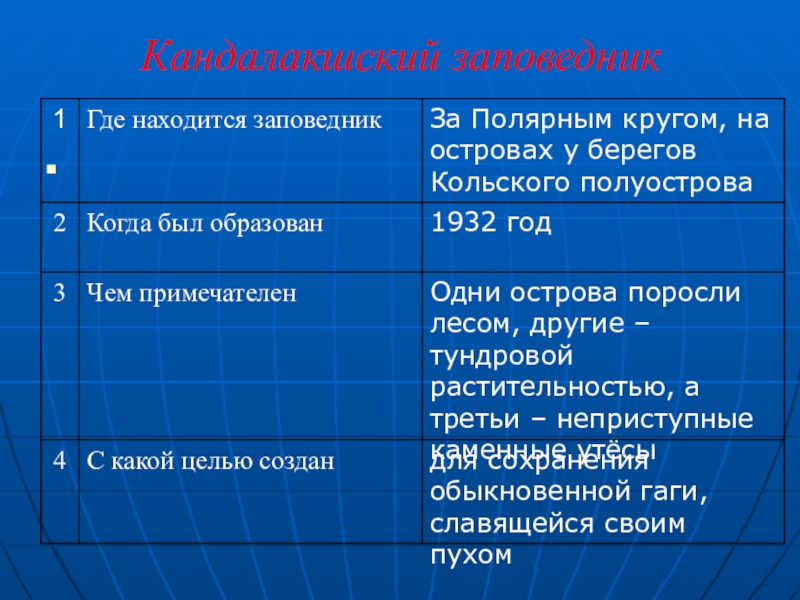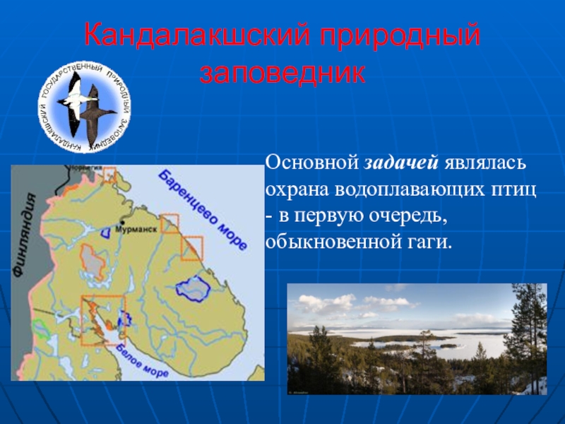 Кандалакшский природный заповедникОсновной задачей являлась охрана водоплавающих птиц - в первую очередь, обыкновенной гаги.