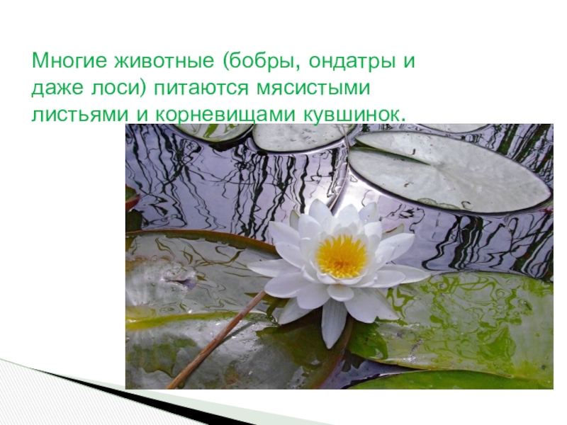 Слайд 4Многие животные (бобры, ондатры и даже лоси) питаются мясистыми листьями и