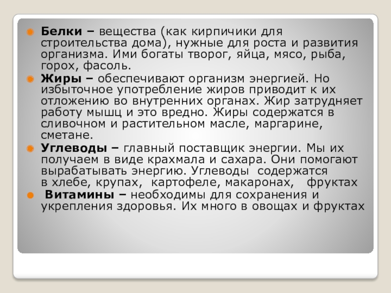 Белки – вещества (как кирпичики для строительства дома), нужные для роста и развития организма. Ими богаты творог, яйца,