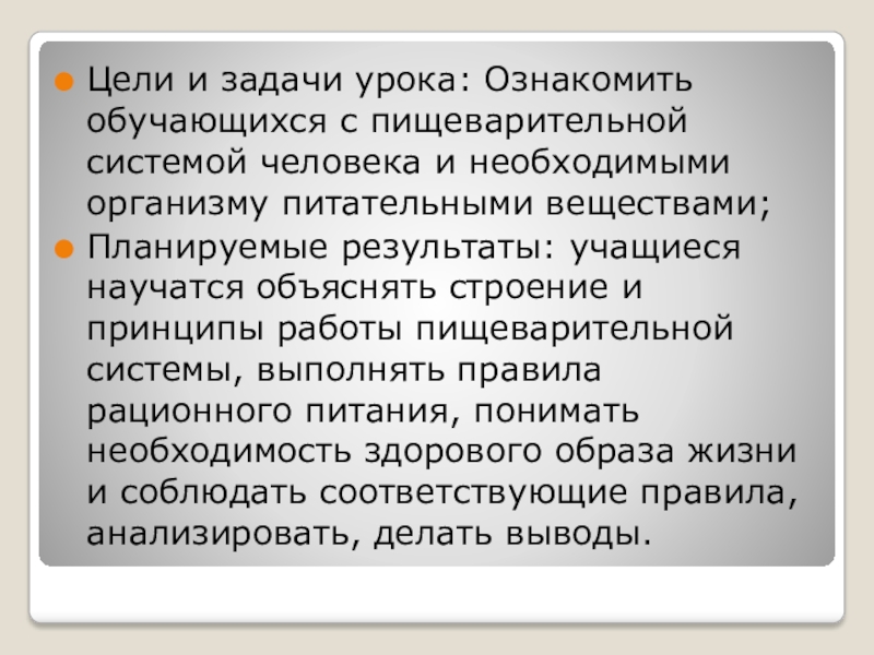 Цели и задачи урока: Ознакомить обучающихся с пищеварительной системой человека и необходимыми организму питательными веществами;Планируемые результаты: учащиеся научатся объяснять строение и принципы работы пищеварительной системы, выполнять правила рационного питания, понимать необходимость здорового образа жизни и соблюдать