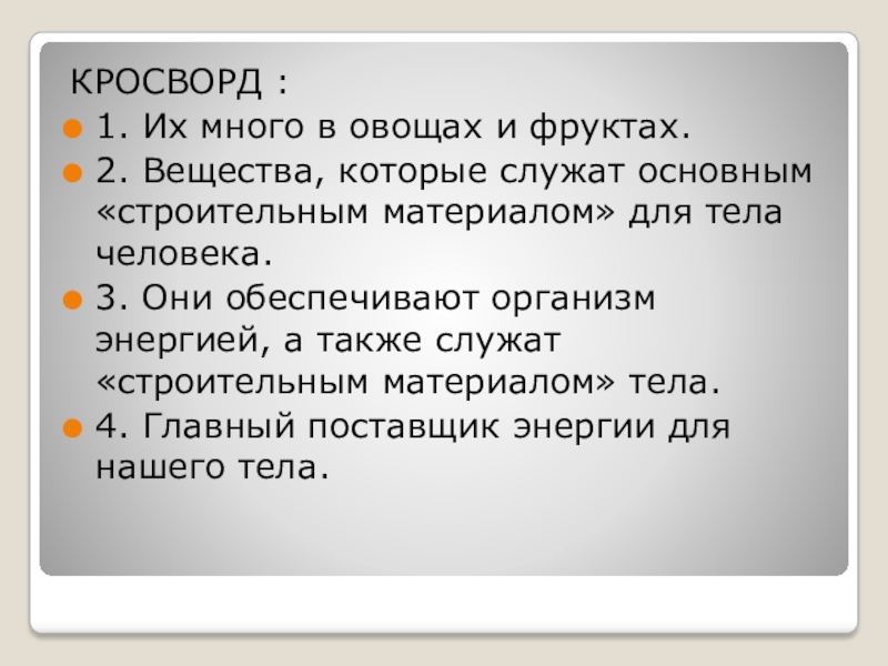 КРОСВОРД :1. Их много в овощах и фруктах.2. Вещества, которые служат основным «строительным материалом» для тела человека.3.