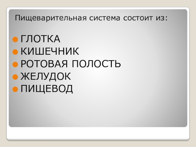 Пищеварительная система состоит из:ГЛОТКАКИШЕЧНИКРОТОВАЯ ПОЛОСТЬЖЕЛУДОКПИЩЕВОД