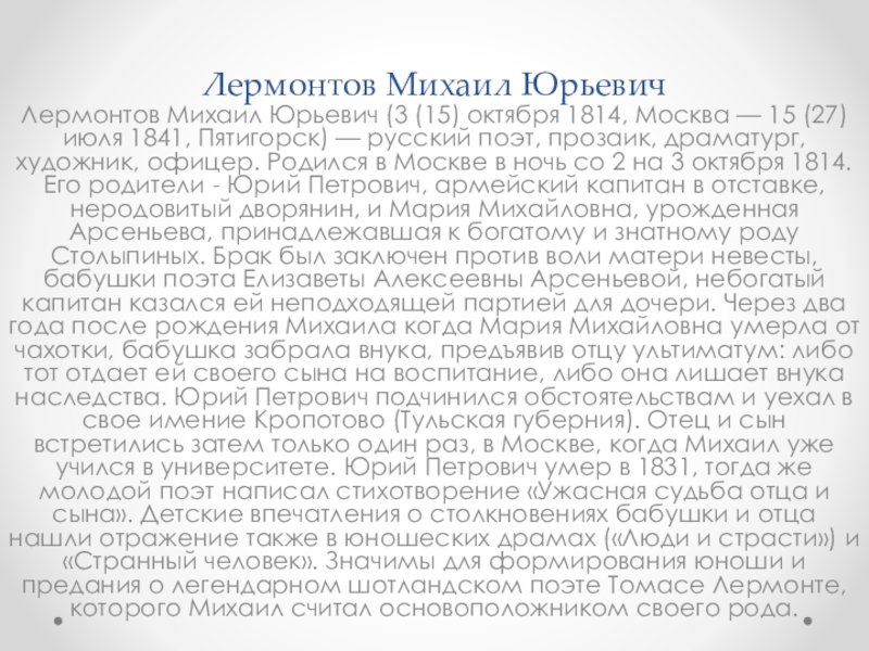 15 (27) июля 1841, Пятигорск) — русский поэт, прозаик, драматург, художник, офицер. Родился в Москве в ночь со 2 на 3 октября 1814. Его родители - Юрий Петрович, армейский капитан в отставке, неродовитый дворянин, и Мария Михайловна, урожденная Арсеньева, принадлежавшая к богатому и знатному роду Столыпиных. Брак был заключен против воли матери невесты, бабушки поэта Елизаветы Алексеевны Арсеньевой, небогатый капитан казался ей неподходящей партией для дочери. Через два года после рождения Михаила когда Мария Михайловна умерла от чахотки, бабушка забрала внука, предъявив отцу ультиматум: либо тот отдает ей своего сына на воспитание, либо она лишает внука наследства. Юрий Петрович подчинился обстоятельствам и уехал в свое имение Кропотово (Тульская губерния). Отец и сын встретились затем только один раз, в Москве, когда Михаил уже учился в университете. Юрий Петрович умер в 1831, тогда же молодой поэт написал стихотворение «Ужасная судьба отца и сына». Детские впечатления о столкновениях бабушки и отца нашли отражение также в юношеских драмах («Люди и страсти») и «Странный человек». Значимы для формирования юноши и предания о легендарном шотландском поэте Томасе Лермонте, которого Михаил считал основоположником своего рода.