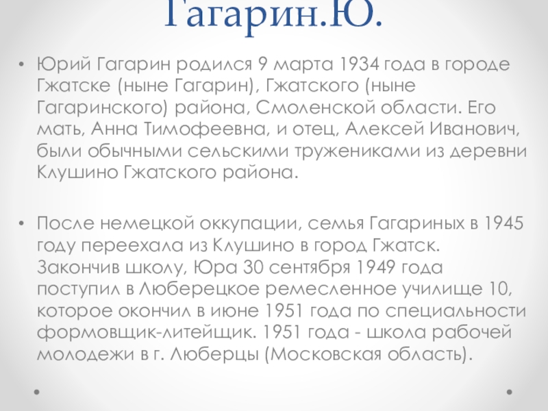 Юрий Гагарин родился 9 марта 1934 года в городе Гжатске (ныне