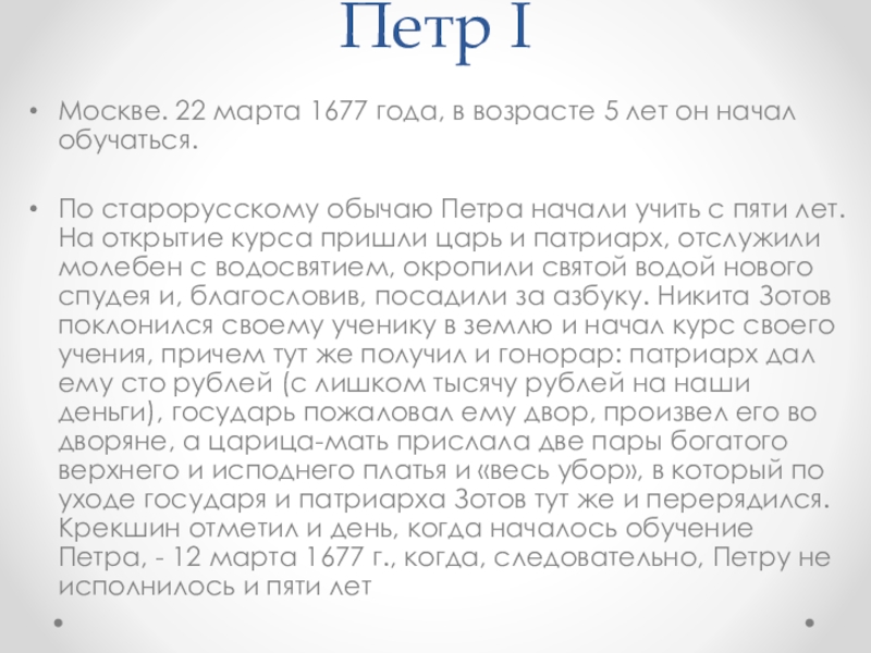 По старорусскому обычаю Петра начали учить с пяти лет. На открытие курса пришли царь и патриарх, отслужили молебен с водосвятием, окропили святой водой нового спудея и, благословив, посадили за азбуку. Никита Зотов поклонился своему ученику в землю и начал курс своего учения, причем тут же получил и гонорар: патриарх дал ему сто рублей (с лишком тысячу рублей на наши деньги), государь пожаловал ему двор, произвел его во дворяне, а царица-мать прислала две пары богатого верхнего и исподнего платья и «весь убор», в который по уходе государя и патриарха Зотов тут же и перерядился. Крекшин отметил и день, когда началось обучение Петра, - 12 марта 1677 г., когда, следовательно, Петру не исполнилось и пяти лет