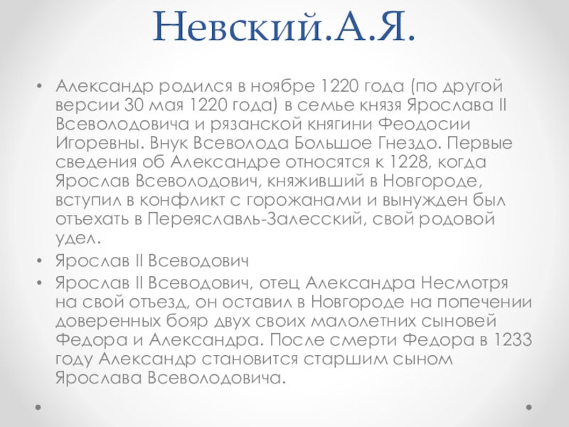 Ярослав II Всеводович, отец Александра Несмотря на свой отъезд, он оставил в Новгороде на попечении доверенных бояр двух своих малолетних сыновей Федора и Александра. После смерти Федора в 1233 году Александр становится старшим сыном Ярослава Всеволодовича.