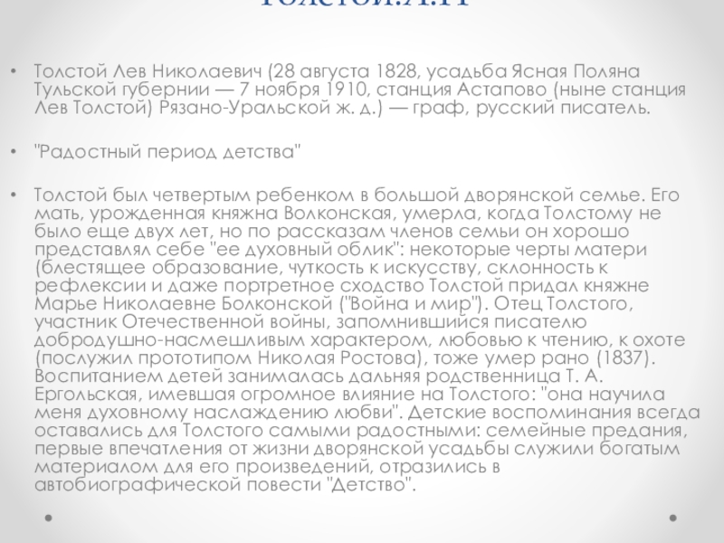 Толстой был четвертым ребенком в большой дворянской семье. Его мать, урожденная княжна Волконская, умерла, когда Толстому не было еще двух лет, но по рассказам членов семьи он хорошо представлял себе "ее духовный облик": некоторые черты матери (блестящее образование, чуткость к искусству, склонность к рефлексии и даже портретное сходство Толстой придал княжне Марье Николаевне Болконской ("Война и мир"). Отец Толстого, участник Отечественной войны, запомнившийся писателю добродушно-насмешливым характером, любовью к чтению, к охоте (послужил прототипом Николая Ростова), тоже умер рано (1837). Воспитанием детей занималась дальняя родственница Т. А. Ергольская, имевшая огромное влияние на Толстого: "она научила меня духовному наслаждению любви". Детские воспоминания всегда оставались для Толстого самыми радостными: семейные предания, первые впечатления от жизни дворянской усадьбы служили богатым материалом для его произведений, отразились в автобиографической повести "Детство".