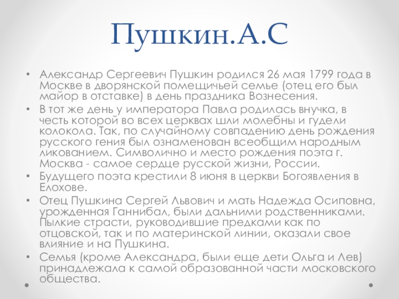 Александр Сергеевич Пушкин родился 26 мая 1799 года в Москве в