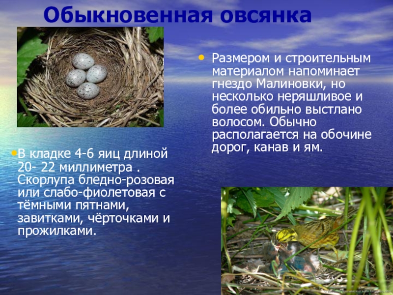 В кладке 4-6 яиц длиной 20- 22 миллиметра . Скорлупа бледно-розовая или слабо-фиолетовая с тёмными пятнами, завитками, чёрточками и прожилками.