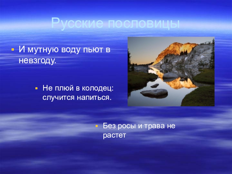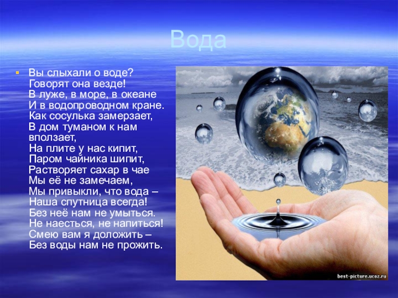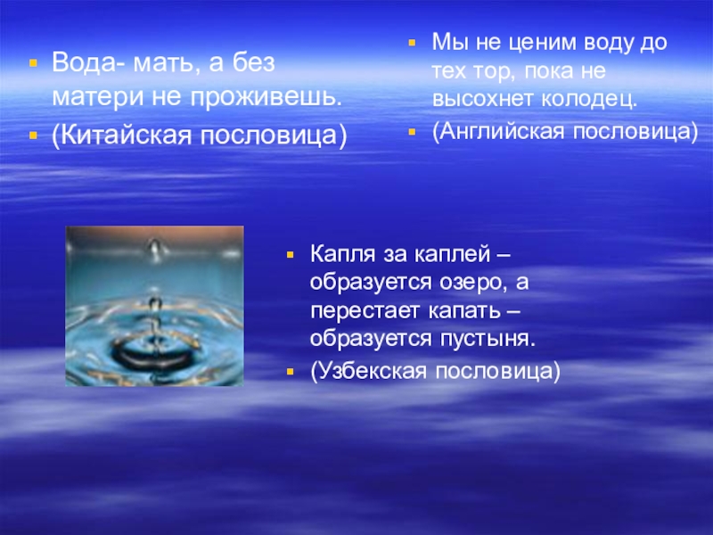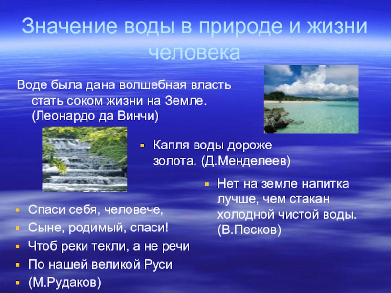 Капля воды дороже золота. (Д.Менделеев)
