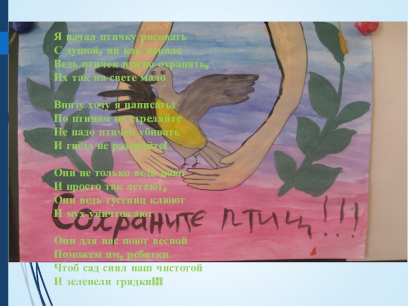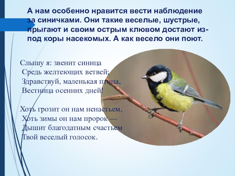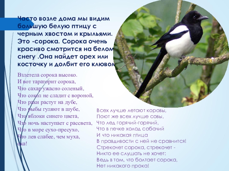 Часто возле дома мы видим большую белую птицу с черным хвостом и крыльями. Это -сорока. Сорока очень красиво смотрится на белом снегу .Она найдет орех или косточку и долбит его клювом.