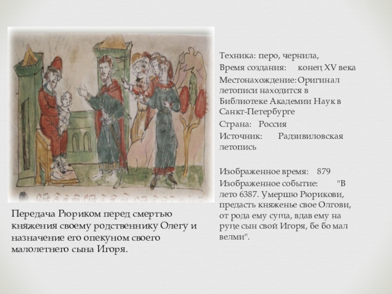 Передача Рюриком перед смертью княжения своему родственнику Олегу и назначение его опекуном своего малолетнего сына Игоря.