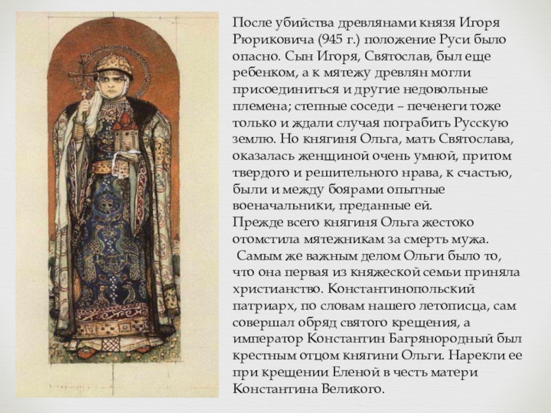 Слайд 30После убийства древлянами князя Игоря Рюриковича (945 г.) положение Руси было