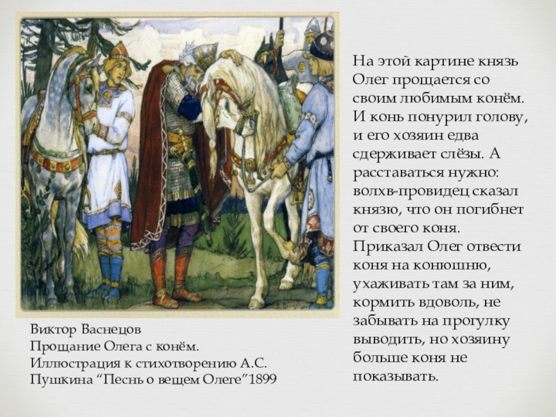 На этой картине князь Олег прощается со своим любимым конём. И конь понурил голову, и его хозяин едва сдерживает слёзы. А расставаться нужно: волхв-провидец сказал князю, что он погибнет от своего коня. Приказал Олег отвести коня на конюшню, ухаживать там за ним, кормить вдоволь, не забывать на прогулку выводить, но хозяину больше коня не показывать.