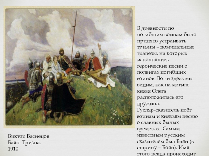 – поминальные трапезы, на которых исполнялись героические песни о подвигах погибших воинов. Вот и здесь мы видим, как на могиле князя Олега расположилась его дружина.