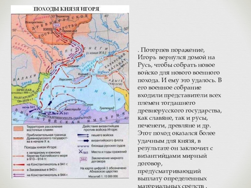войско для нового военного похода. И ему это удалось. В его военное собрание входили представители всех племен тогдашнего древнерусского государства, как славяне, так и русы, печенеги, древляне и др. Этот поход оказался более удачным для князя, в результате он заключил с византийцами мирный договор, предусматривающий выплату определенных материальных средств .