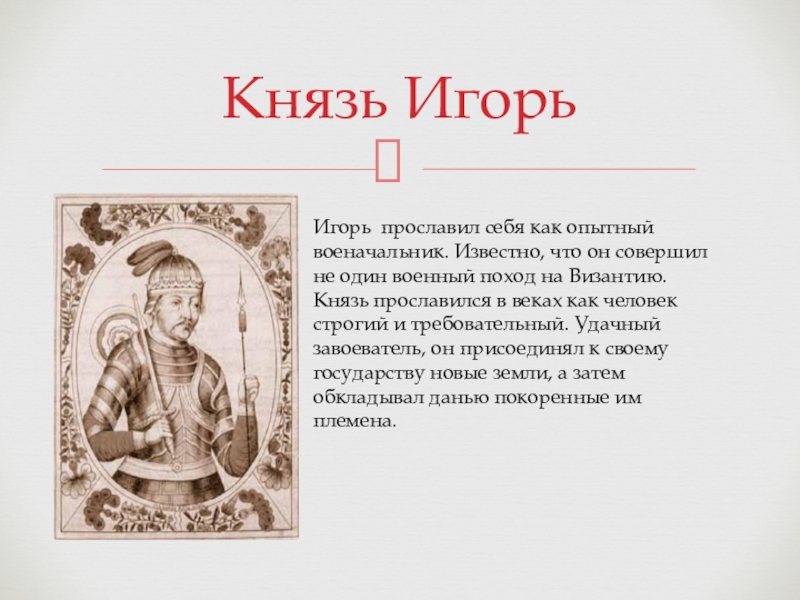не один военный поход на Византию. Князь прославился в веках как человек строгий и требовательный. Удачный завоеватель, он присоединял к своему государству новые земли, а затем обкладывал данью покоренные им племена.