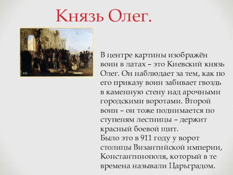 князь Олег. Он наблюдает за тем, как по его приказу воин забивает гвоздь в каменную стену над арочными городскими воротами. Второй воин – он тоже поднимается по ступеням лестницы – держит красный боевой щит.