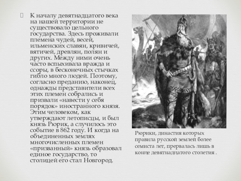 Здесь проживали племена чудей, весей, ильменских славян, кривичей, вятичей, древлян, полян и других. Между ними очень часто вспыхивала вражда и ссоры, в бесконечных стычках гибло много людей. Поэтому, согласно преданию, наконец, однажды представители всех этих племен собрались и призвали «навести у себя порядок» иностранного князя. Этим человеком, как утверждают летописцы, и был князь Рюрик, а случилось это событие в 862 году. И когда на объединенных землях многочисленных племен «призванный» князь образовал единое государство, то столицей его стал Новгород.