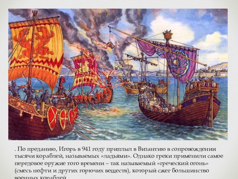 Слайд 25. По преданию, Игорь в 941 году приплыл в Византию в