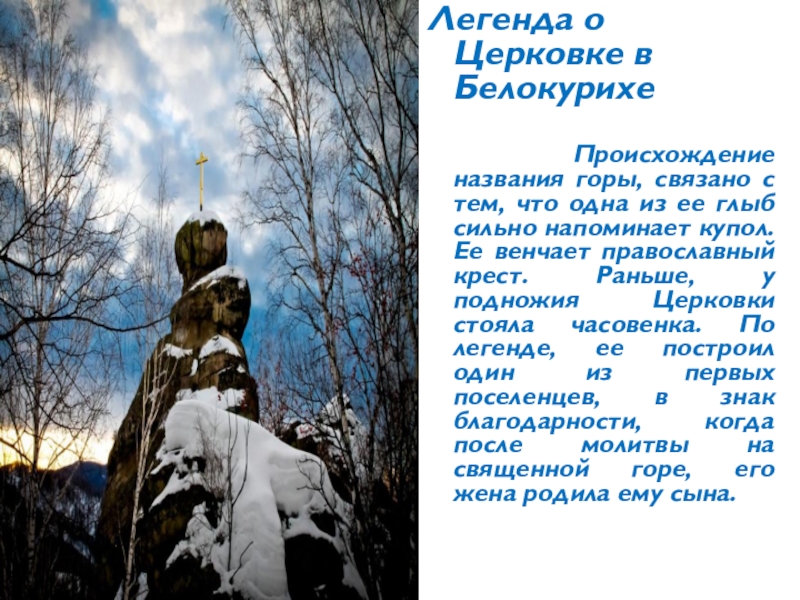 Легенда о Церковке в Белокурихе   Происхождение названия горы, связано с тем, что одна из ее