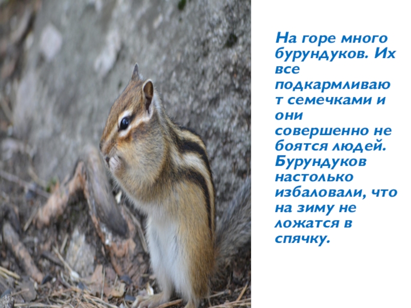 Слайд 11 На горе много бурундуков. Их все подкармливают семечками и