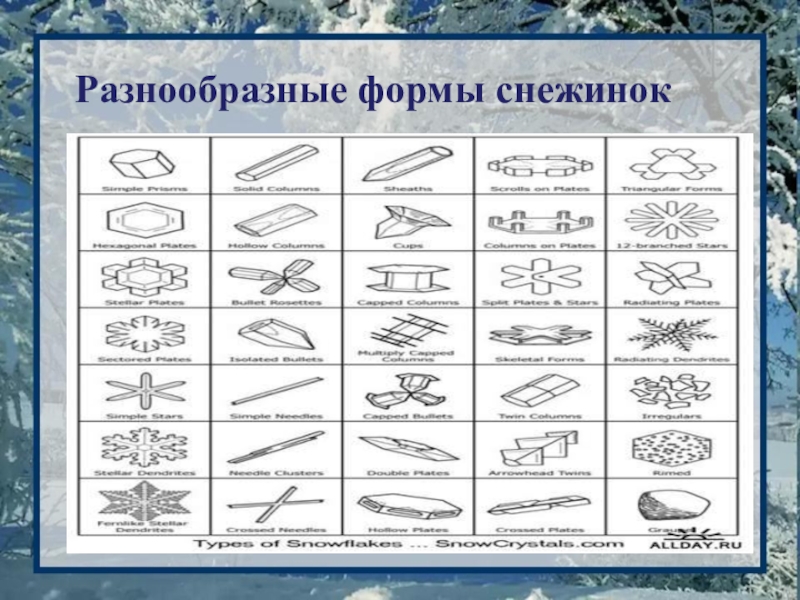 Разработана даже специальная международная классификация, в которой снежинки объединяются в десять классов: это звёздочки, пластинки, столбики, иглы, град и другие. Размеры снежинок могут быть от маленькой точки до 7 миллиметров.