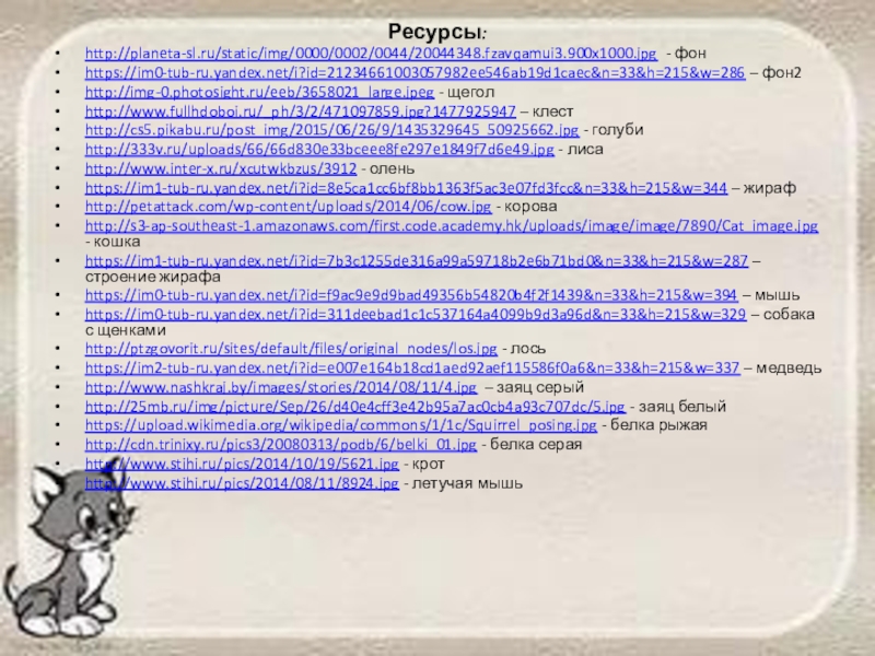 Ресурсы:http://planeta-sl.ru/static/img/0000/0002/0044/20044348.fzavqamui3.900x1000.jpg - фонhttps://im0-tub-ru.yandex.net/i?id=21234661003057982ee546ab19d1caec&n=33&h=215&w=286 – фон2http://img-0.photosight.ru/eeb/3658021_large.jpeg - щеголhttp://www.fullhdoboi.ru/_ph/3/2/471097859.jpg?1477925947 – клестhttp://cs5.pikabu.ru/post_img/2015/06/26/9/1435329645_50925662.jpg - голубиhttp://333v.ru/uploads/66/66d830e33bceee8fe297e1849f7d6e49.jpg - лисаhttp://www.inter-x.ru/xcutwkbzus/3912 - оленьhttps://im1-tub-ru.yandex.net/i?id=8e5ca1cc6bf8bb1363f5ac3e07fd3fcc&n=33&h=215&w=344 – жирафhttp://petattack.com/wp-content/uploads/2014/06/cow.jpg