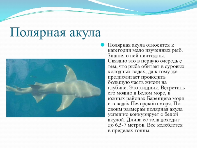 ней ничтожны. Связано это в первую очередь с тем, что рыба обитает в суровых холодных водах, да к тому же предпочитает проводить большую часть жизни на глубине. Это хищник. Встретить его можно в Белом море, в южных районах Баренцева моря и в водах Печорского моря. По своим размерам полярная акула успешно конкурирует с белой акулой. Длина её тела доходит до 6,5-7 метров. Вес колеблется в пределах тонны.