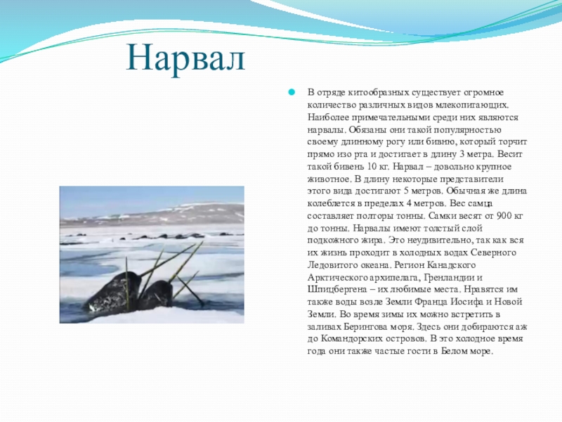 различных видов млекопитающих. Наиболее примечательными среди них являются нарвалы. Обязаны они такой популярностью своему длинному рогу или бивню, который торчит прямо изо рта и достигает в длину 3 метра. Весит такой бивень 10 кг. Нарвал – довольно крупное животное. В длину некоторые представители этого вида достигают 5 метров. Обычная же длина колеблется в пределах 4 метров. Вес самца составляет полторы тонны. Самки весят от 900 кг до тонны. Нарвалы имеют толстый слой подкожного жира. Это неудивительно, так как вся их жизнь проходит в холодных водах Северного Ледовитого океана. Регион Канадского Арктического архипелага, Гренландии и Шпицбергена – их любимые места. Нравятся им также воды возле Земли Франца Иосифа и Новой Земли. Во время зимы их можно встретить в заливах Берингова моря. Здесь они добираются аж до Командорских островов. В это холодное время года они также частые гости в Белом море.