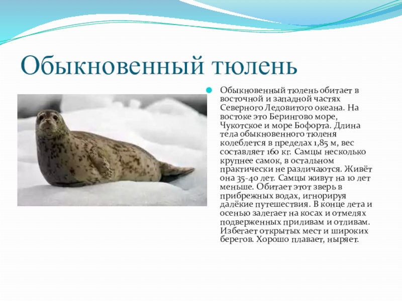 океана. На востоке это Берингово море, Чукотское и море Бофорта. Длина тела обыкновенного тюленя колеблется в пределах 1,85 м, вес составляет 160 кг. Самцы несколько крупнее самок, в остальном практически не различаются. Живёт она 35-40 лет. Самцы живут на 10 лет меньше. Обитает этот зверь в прибрежных водах, игнорируя далёкие путешествия. В конце лета и осенью залегает на косах и отмелях подверженных приливам и отливам. Избегает открытых мест и широких берегов. Хорошо плавает, ныряет.
