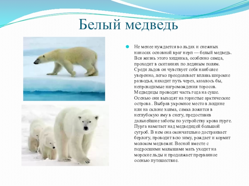 Не менее нуждается во льдах и снежных наносах основной враг нерп — белый медведь. Вся жизнь этого хищника, особенно самца, проходит в скитаниях по ледяным полям. Среди льдов он чувствует себя наиболее уверенно, легко преодолевает вплавь широкие разводья, находит путь через, казалось бы, непроходимые нагромождения торосов. Медведицы проводят часть года на суше. Осенью они выходят на гористые арктические острова . Выбрав укромное место в лощине или на склоне холма, самка ложится в неглубокую яму в снегу, предоставив дальнейшие заботы по устройству крова пурге. Пурга наметает над медведицей большой сугроб. В нем она окончательно достраивает берлогу, проводит всю зиму, рождает и кормит молоком медвежат. Весной вместе с подросшими малышами мать уходит на морские льды и продолжает прерванное осенью путешествие.