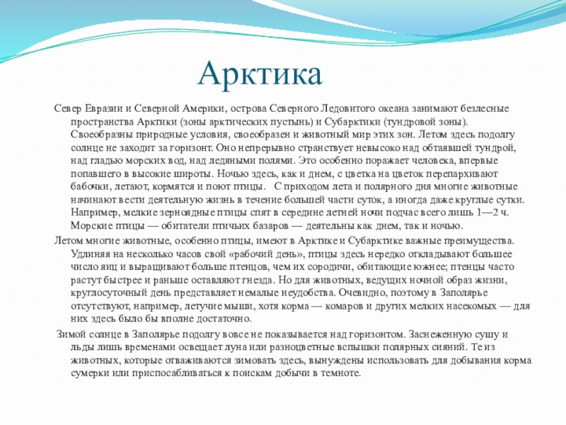 Евразии и Северной Америки, острова Северного Ледовитого океана занимают безлесные пространства Арктики (зоны арктических пустынь) и Субарктики (тундровой зоны). Своеобразны природные условия, своеобразен и животный мир этих зон. Летом здесь подолгу солнце не заходит за горизонт. Оно непрерывно странствует невысоко над обтаявшей тундрой, над гладью морских вод, над ледяными полями. Это особенно поражает человека, впервые попавшего в высокие широты. Ночью здесь, как и днем, с цветка на цветок перепархивают бабочки, летают, кормятся и поют птицы. С приходом лета и полярного дня многие животные начинают вести деятельную жизнь в течение большей части суток, а иногда даже круглые сутки. Например, мелкие зерноядные птицы спят в середине летней ночи подчас всего лишь 1—2 ч. Морские птицы — обитатели птичьих базаров — деятельны как днем, так и ночью.