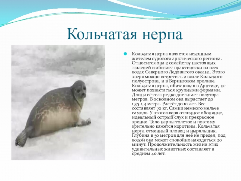 исконным жителем сурового арктического региона. Относится она к семейству настоящих тюленей и обитает практически во всех водах Северного Ледовитого океана. Этого зверя можно встретить и возле Кольского полуострова, и в Беринговом проливе. Кольчатая нерпа, обитающая в Арктике, не может похвастаться крупными формами. Длина её тела редко достигает полутора метров. В основном она вырастает до 1,35-1,4 метра. Растёт до 10 лет. Вес составляет 70 кг. Самки немного мельче самцов. У этого зверя отличное обоняние, идеальный острый слух и прекрасное зрение. Тело нерпы толстое и поэтому зрительно кажется коротким. Кольчатая нерпа отменный пловец и ныряльщик. Глубина в 50 метров для неё не предел, под водой она может спокойно находиться 20 минут. Продолжительность жизни этих удивительных животных составляет в среднем 40 лет.