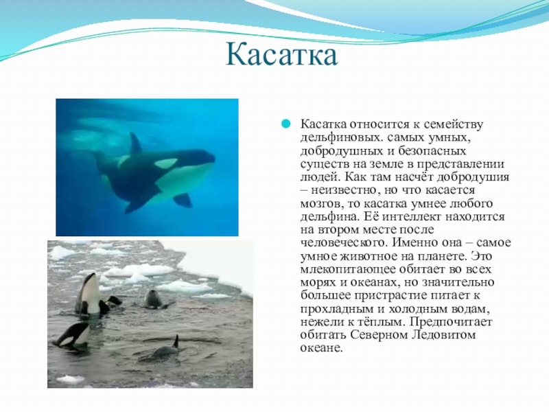 Касатка относится к семейству дельфиновых. самых умных, добродушных и безопасных существ на земле в представлении людей. Как там насчёт добродушия – неизвестно, но что касается мозгов, то касатка умнее любого дельфина. Её интеллект находится на втором месте после человеческого. Именно она – самое умное животное на планете. Это млекопитающее обитает во всех морях и океанах, но значительно большее пристрастие питает к прохладным и холодным водам, нежели к тёплым. Предпочитает обитать Северном Ледовитом океане.