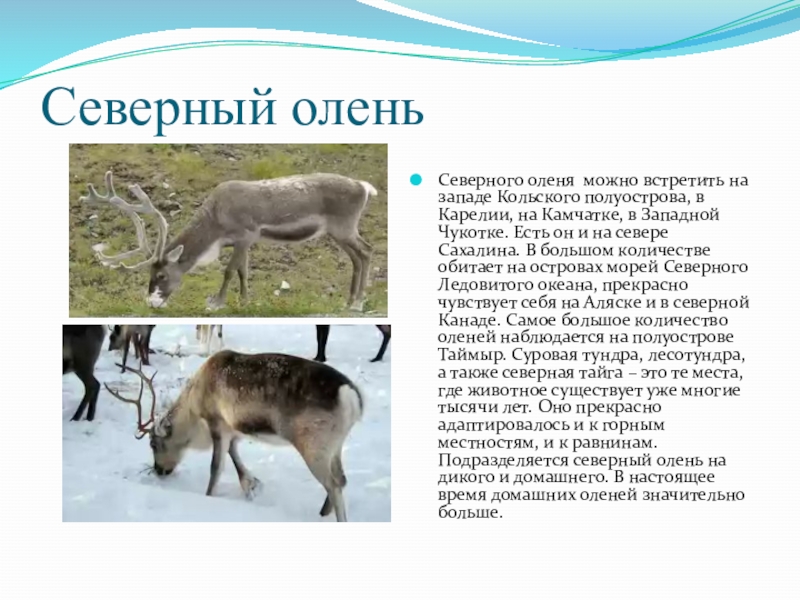 на Камчатке, в Западной Чукотке. Есть он и на севере Сахалина. В большом количестве обитает на островах морей Северного Ледовитого океана, прекрасно чувствует себя на Аляске и в северной Канаде. Самое большое количество оленей наблюдается на полуострове Таймыр. Суровая тундра, лесотундра, а также северная тайга – это те места, где животное существует уже многие тысячи лет. Оно прекрасно адаптировалось и к горным местностям, и к равнинам. Подразделяется северный олень на дикого и домашнего. В настоящее время домашних оленей значительно больше.