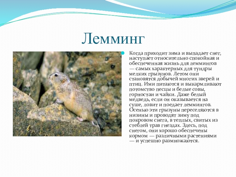 приходит зима и выпадает снег, наступает относительно спокойная и обеспеченная жизнь для леммингов — самых характерных для тундры мелких грызунов. Летом они становятся добычей многих зверей и птиц. Ими питаются и выкармливают потомство песцы и белые совы, горностаи и чайки. Даже белый медведь, если он оказывается на суше, ловит и поедает леммингов. Осенью эти грызуны переселяются в низины и проводят зиму под покровом снега, в теплых, свитых из стеблей трав гнездах. Здесь, под снегом, они хорошо обеспечены кормом — различными растениями — и успешно размножаются.
