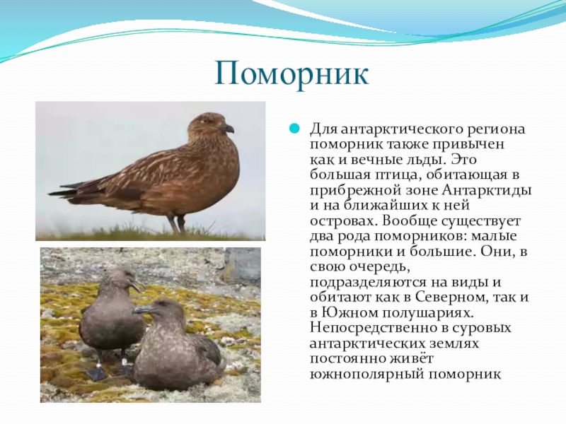 Для антарктического региона поморник также привычен как и вечные льды. Это большая птица, обитающая в прибрежной зоне Антарктиды и на ближайших к ней островах. Вообще существует два рода поморников: малые поморники и большие. Они, в свою очередь, подразделяются на виды и обитают как в Северном, так и в Южном полушариях. Непосредственно в суровых антарктических землях постоянно живёт южнополярный поморник