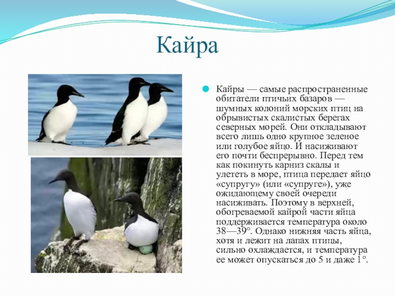 Кайры — самые распространенные обитатели птичьих базаров — шумных колоний морских птиц на обрывистых скалистых берегах северных морей. Они откладывают всего лишь одно крупное зеленое или голубое яйцо. И насиживают его почти беспрерывно. Перед тем как покинуть карниз скалы и улететь в море, птица передает яйцо «супругу» (или «супруге»), уже ожидающему своей очереди насиживать. Поэтому в верхней, обогреваемой кайрой части яйца поддерживается температура около 38—39°. Однако нижняя часть яйца, хотя и лежит на лапах птицы, сильно охлаждается, и температура ее может опускаться до 5 и даже 1°.