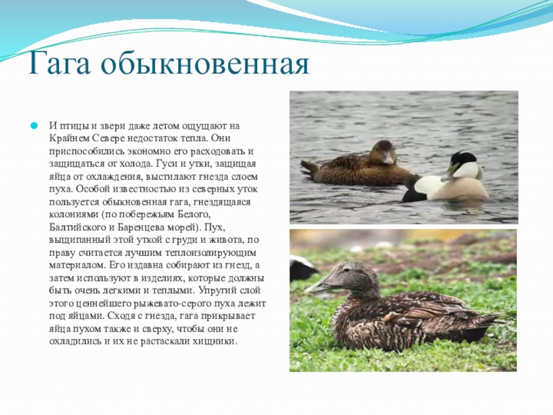 недостаток тепла. Они приспособились экономно его расходовать и защищаться от холода. Гуси и утки, защищая яйца от охлаждения, выстилают гнезда слоем пуха. Особой известностью из северных уток пользуется обыкновенная гага, гнездящаяся колониями (по побережьям Белого, Балтийского и Баренцева морей). Пух, выщипанный этой уткой с груди и живота, по праву считается лучшим теплоизолирующим материалом. Его издавна собирают из гнезд, а затем используют в изделиях, которые должны быть очень легкими и теплыми. Упругий слой этого ценнейшего рыжевато-серого пуха лежит под яйцами. Сходя с гнезда, гага прикрывает яйца пухом также и сверху, чтобы они не охладились и их не растаскали хищники.
